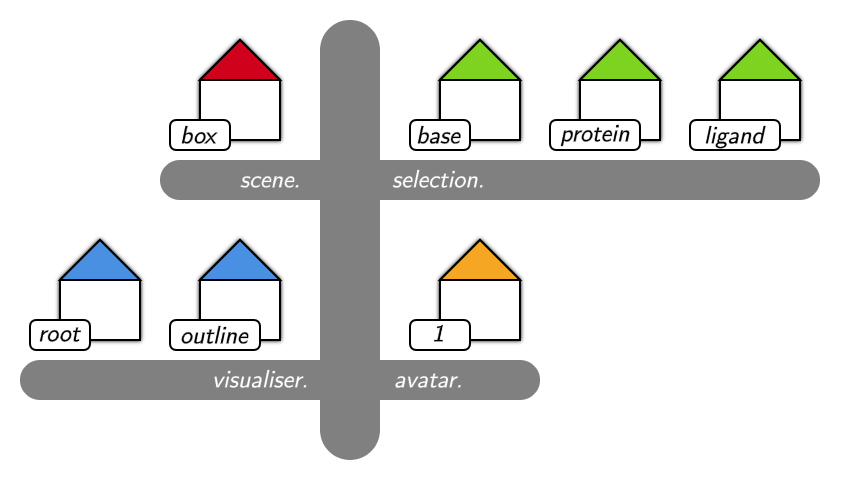 Each item in the shared state has a key which identifies it, such as "scene.box" or "selection.protein". More specifically, it identifies ‘where’ it is. If I want to know the current value of something, I look up the key in the shared state and see if a value is present and what is is.